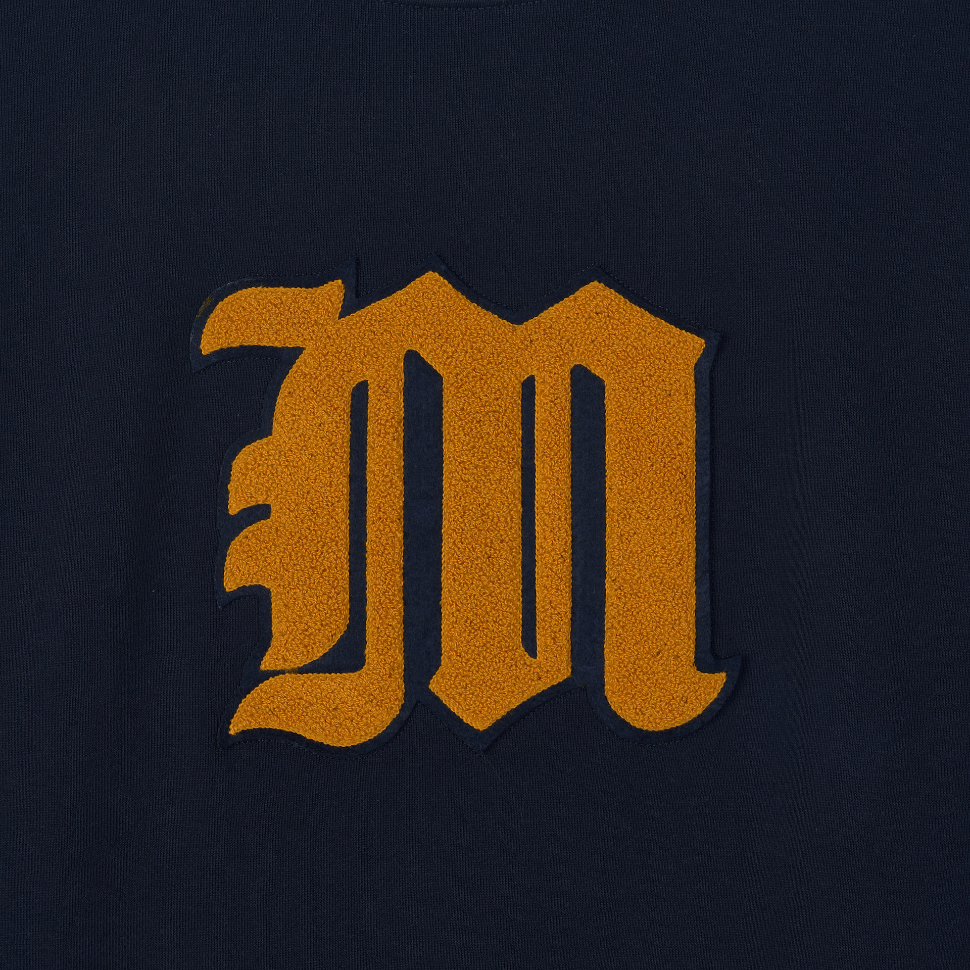 전면 old english M 로고를 펠트와 부클 자수로 입체감을 표현.